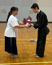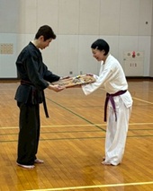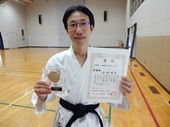 審査会での様子をアップしたいところですが、自分が進行をしているため、写真を撮ることができません。残念!(+o+) 審査会後の会長との撮影をアップします。 思い出に残る審査会だったと思います。 初段合格おめでとうございました! とうとう黒帯! まずは、一つの大きな目標を達成しました。ここで留まらず、次の目標に向かって益々頑張ってくださいね。(^^) |